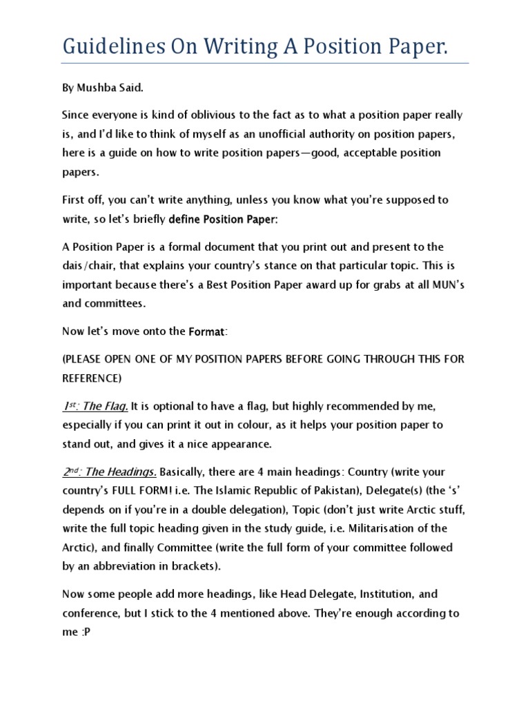 Doc Preet Kaur Position Paper For Nigeria Who Mun Docx Preet Kaur Academia Edu from 0.academia-photos.com Chris was an amazing, award winning model un delegate. These tips will make your position paper writing easier. Position papers are required for all delegations. Avoid adding new facts to the last paragraph. End your paper with a plan of action, a suggestion for further research, or idea on how to solve the controversy. Position papers may serve as a starting point for negotiations and debate at the conference. Jccc model un team news; Having an outstanding position paper could be the tiebreaker to win an award.